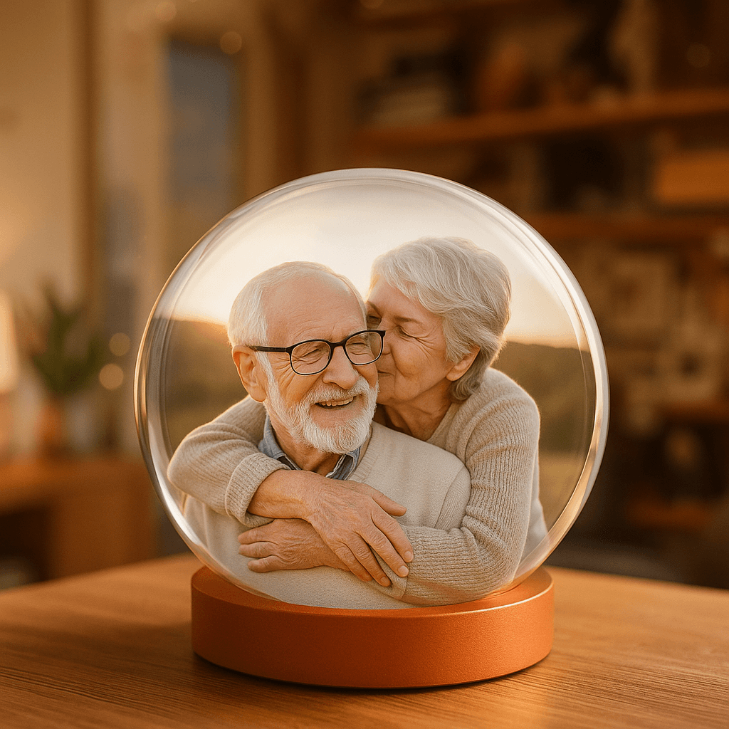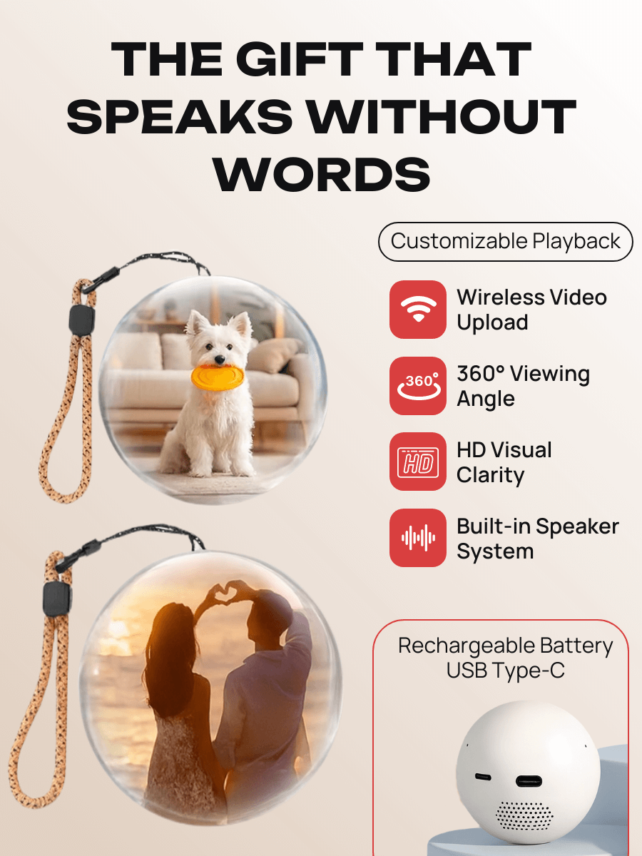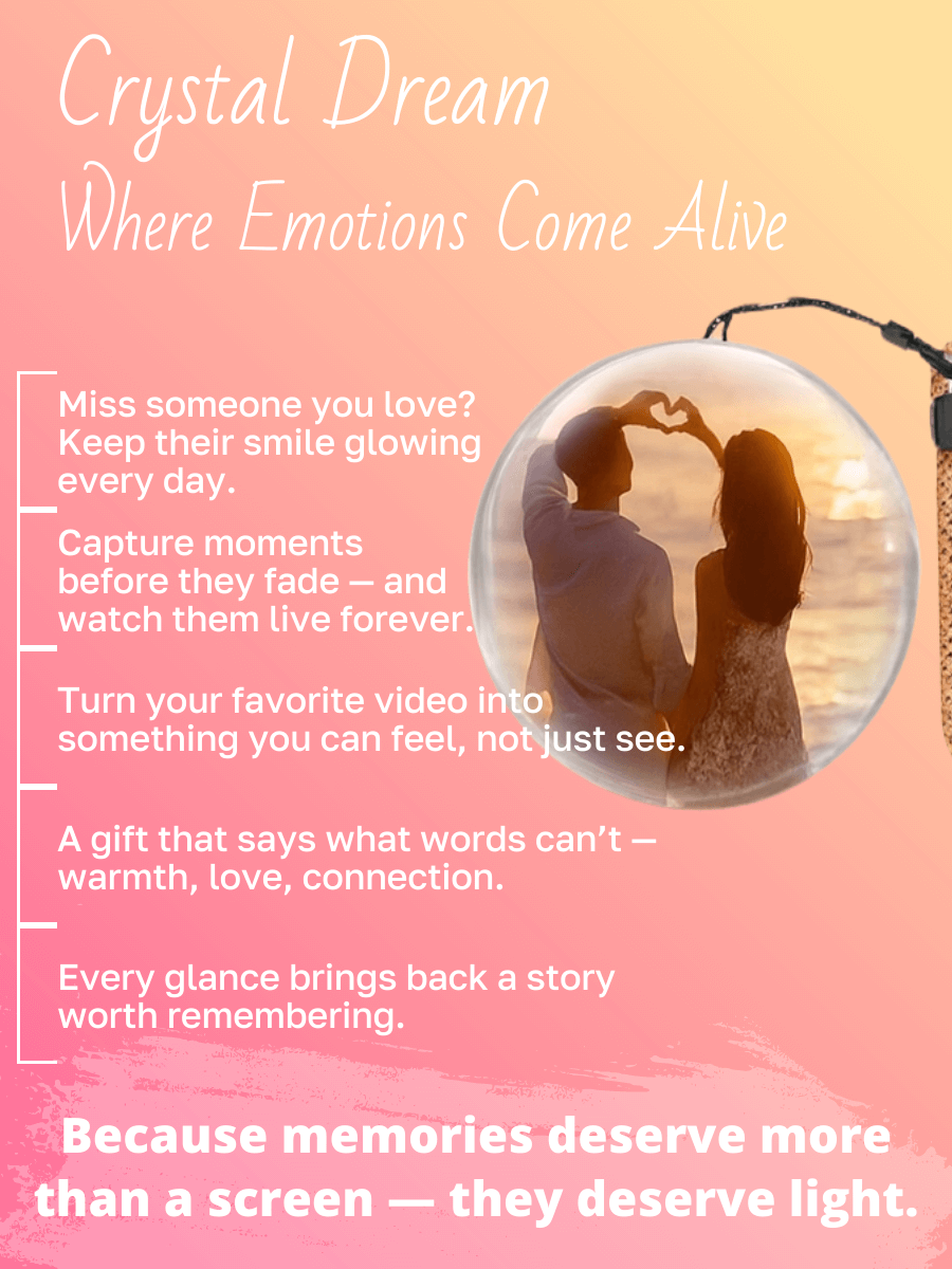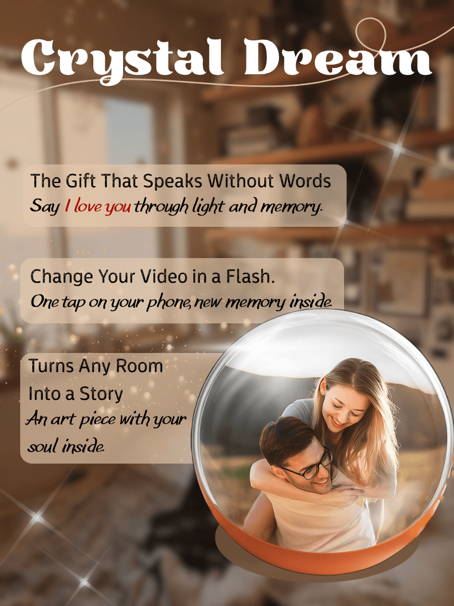 Upload your favorite videos or photos, and watch them float inside a glowing crystal sphere with stunning 3D depth. Every glance brings a smile, a tear, or a story back to life.